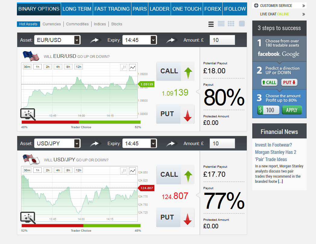 Banc De Binary utilizes its very own proprietary trading system. The trading system is extremely user-friendly with clear tabs that move investors along efficiently so they can conveniently choose any one of the tradable properties such as currencies, commodities and indices and decide which available trading style is suitable for their profession.